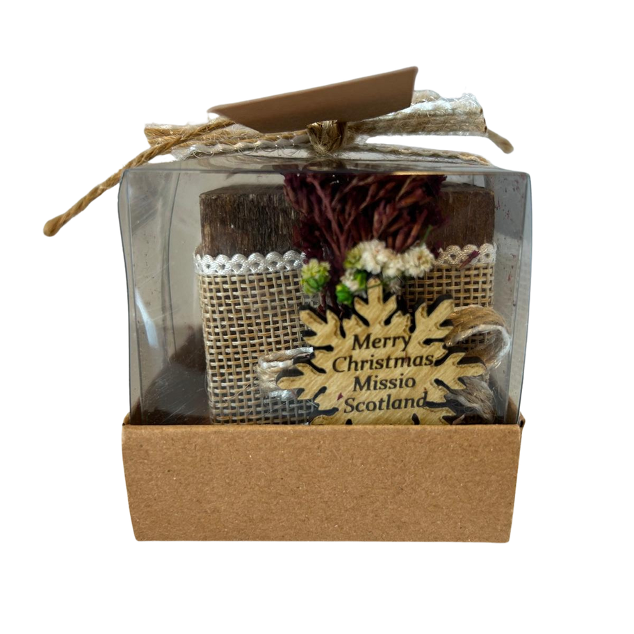 Eco-friendly wooden tealights with a Missio Scotland tag. A warm, reusable decoration that brings gentle Christmas glow to any home.